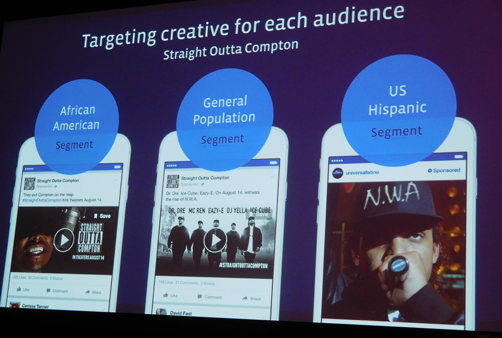 伝説のヒップホップグループN.W.Aの成功と挫折を描いた『ストレイト・アウタ・コンプトン』は、Facebookだからこそ可能なセグメント化されたターゲティングを行い、クリエィティブ表現も変えて、それぞれのターゲットに映画の内容を訴求した。