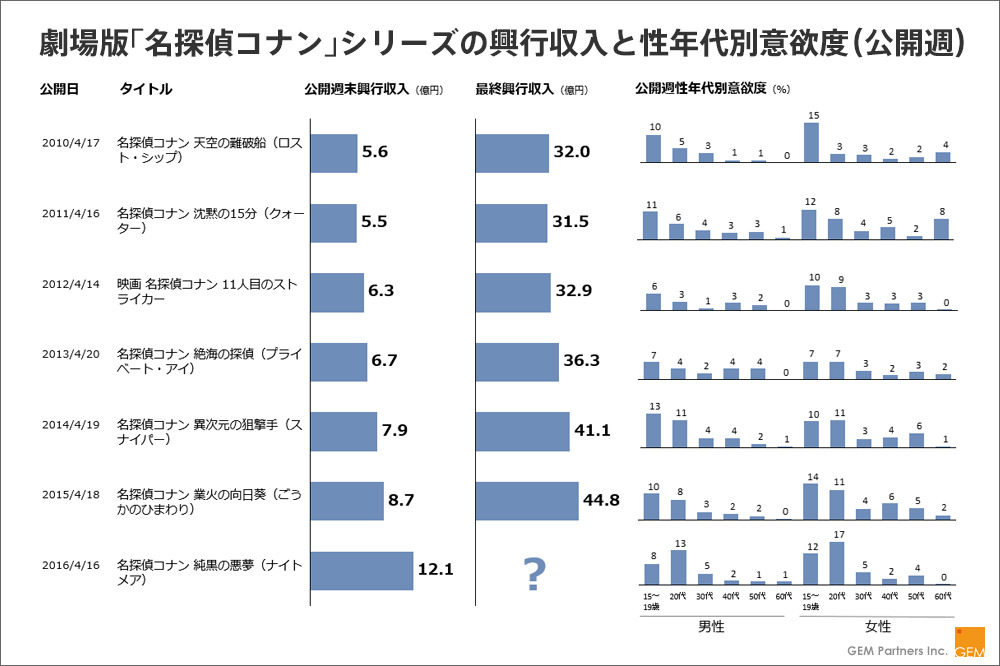 こうした人気アニメシリーズは子供のころに見ていても、成長とともに「卒業」するので、同じ年代のファン層を獲得して市場規模を維持していく。しかし、「コナン」はこれまでの鑑賞意欲層をみると、かつての男女10代中心から、10代だけでなく20代へと広がっている。新しい「入学」ファンを獲得するとともに、「在学」中のファンがそのまま卒業せずに残り、また「卒業生」も再び劇場に足を運びたくなる訴求力を高めていることがうかがえる。今年は、原作でも謎に包まれている「黒の組織」の内情の一部が明らかになることもファンに訴求したとみられる。