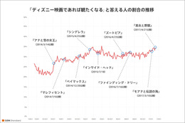 特筆すべき点として、公開2週目の週末興収が前週比で9%しか落ちていないこと。認知率も公開週の68.5%から76.1%に上昇している。また、すでに映画館で見たと答える割合と鑑賞意欲率の合計も前週比5ポイント上昇して20.1%となっている。意欲層もシニアにまで広がった。(参照「③ すでに観た+意欲率の推移」「④ すでに観た+意欲率の推移 過去作品比較」「⑤ 意欲率の推移 性年代別」)