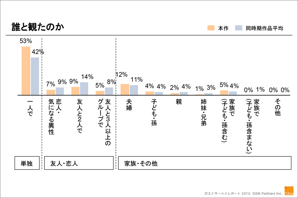 ただし、ヒット作は一人ではなく誰かと観られることが多いが、本作は「一人で」観たという割合が同時期や過去の作品と比べて高い。すなわち、本作鑑賞者は、ライト層が多いにも関わらず、一人で劇場に足を運んでいる人が多いことが特徴である。