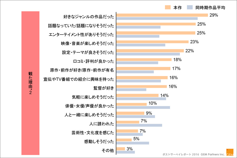 ただし、観た理由として、「話題になっていた」「エンターテイメント性がありそうだった」「映像・音楽が楽しめそうだった」が「監督」よりも上位にあり、他作品に比べても特に高くなっている。