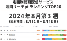 定額制動画配信サービス 週間リーチptランキングTOP20【最新週】